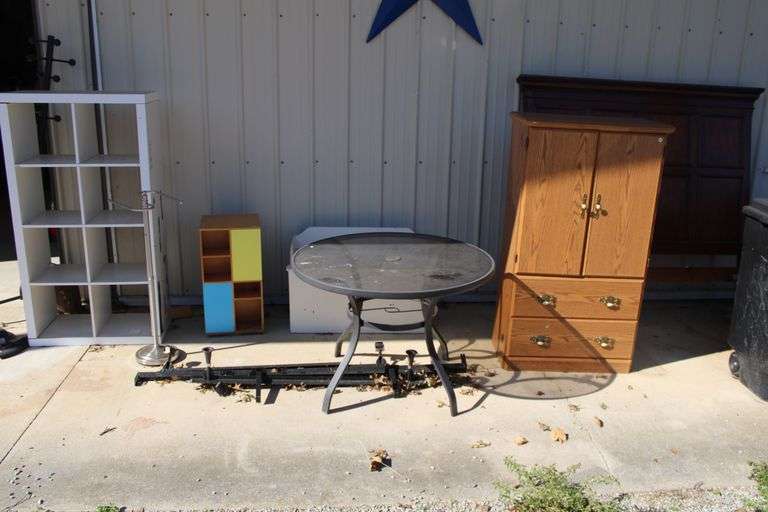Nice wooden headboard, patio dining table, laminate armoire cabinet, white bookcase, towel rack, white storage bench, patio umbrella, clothing rack, and metal bed frame. Finish wear and damage on items. See photos for more details. No other items included.