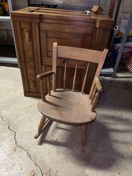 Vintage washstand with original casters(one leg needs repaired) and nickels and stone child's rocking chair.