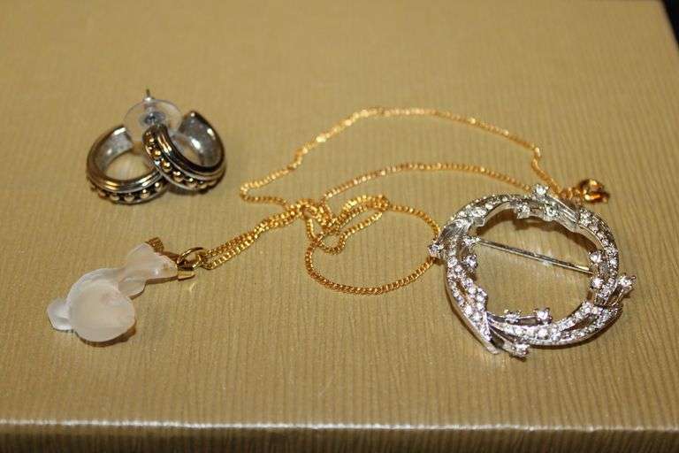 Fantastic Costume Jewelry Earrings, Rhinestone Brooch, and Dolphin Pendant Necklace. In overall good condition with minor finish wear. See photos for more details. No other items included.