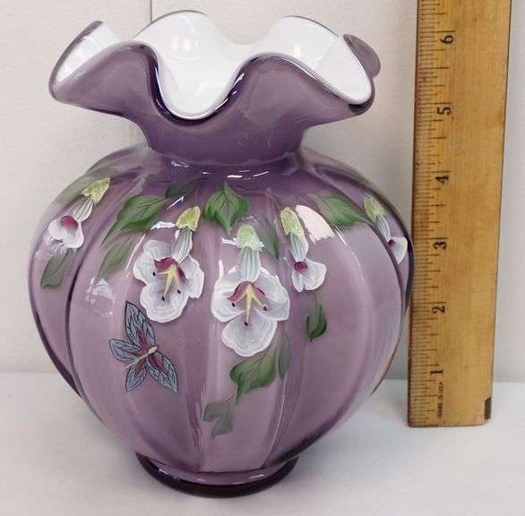 LOT 94 - Fenton 2005 Panel Rib Vase Handpainted Dragonfly & Sweet Briar Plum # 6851