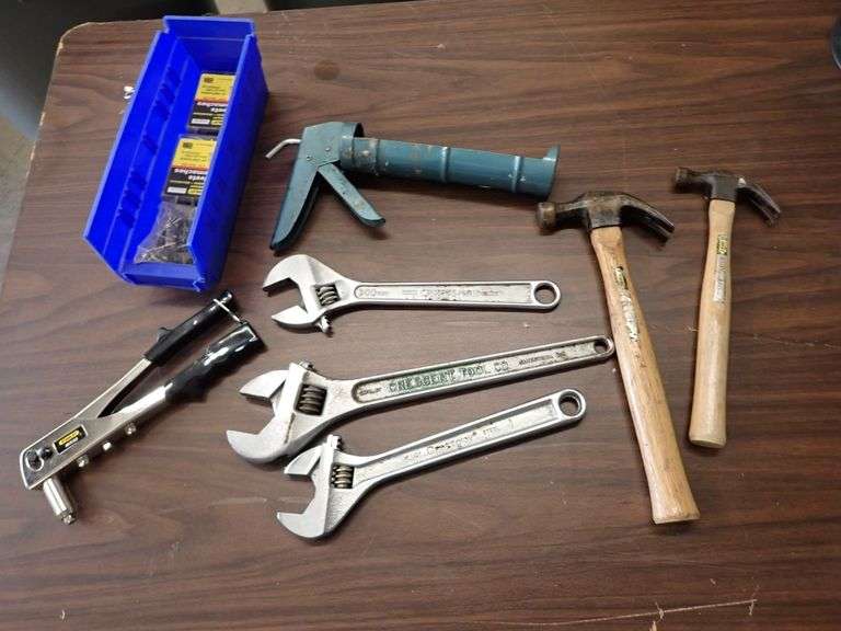 LOT 63 - STANLEY MR55 RIVET GUN - 3 ADJUSTABLE WRENCHES - STANLEY HAMMERS - CAULK GUN