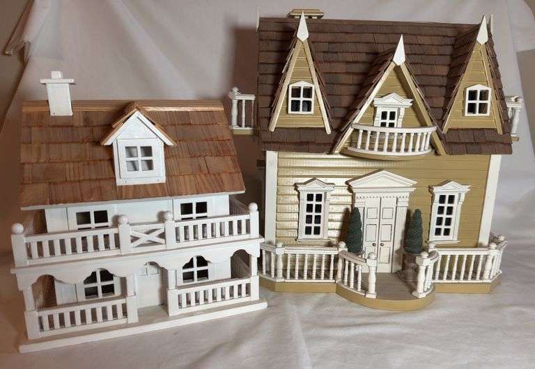 2 decorative bird houses. White house can hang on wall and measures 10 1/4"l x 10 3/4"h. Tan Victorian house measures 14 1/4"l x15"h and has damage to upper railing on one end.