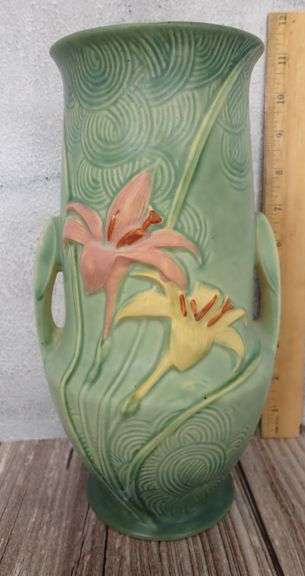 LOT 56 - Roseville Pottery Large Green Zephyr Lily 138-10" Double Handled Vase