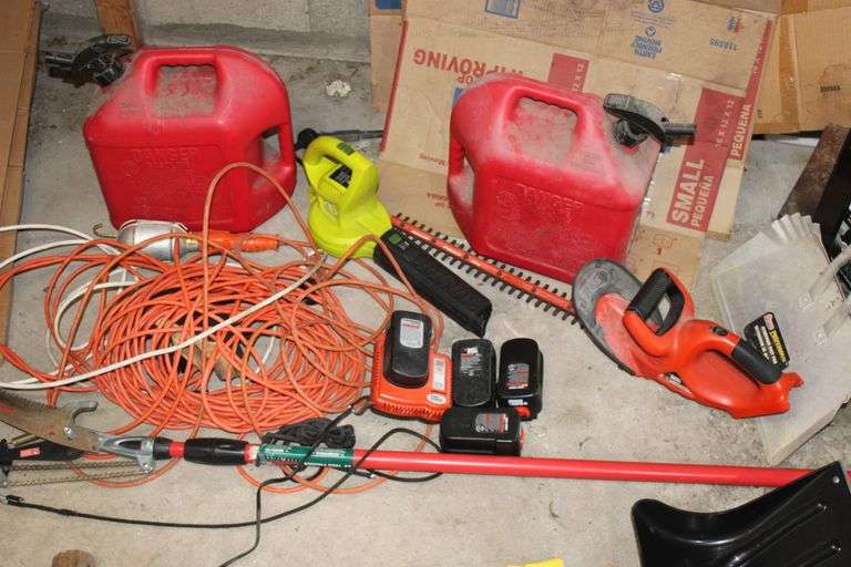 Cordless hedge trimmer, branch trimmer, leaf blower, gas cans, batteries, extension cord, and other items. All untested. In overall good condition with finish wear. See photos for more details. No other items included.