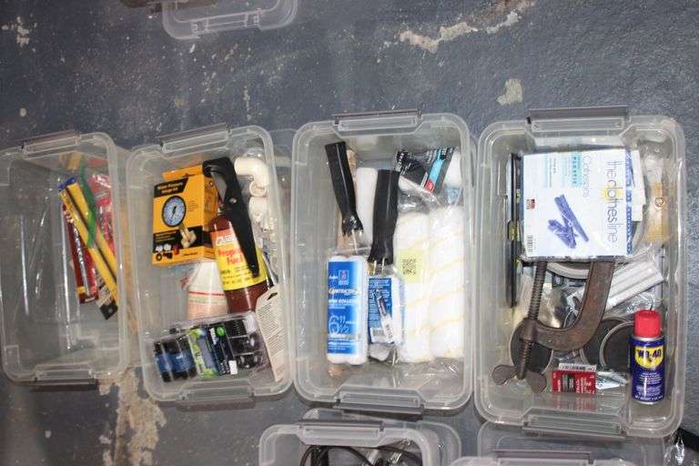 Painting supplies, clamp, drill bits, and other items in plastic totes. In overall good condition with finish wear on some items. See photos for more details. No other items included.