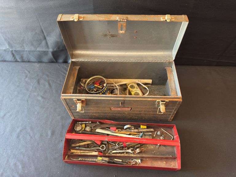 Metal Craftsman toolbox (dented, rusty) with contents. See photos.
