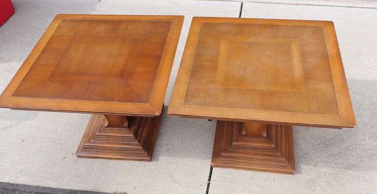 These tables feature a square top with a decorative inlay and a pedestal base with a tiered design. The tables are made of solid maple wood and have a warm, honey-toned finish. The dimensions of each table are approximately 22 inches wide, 22 inches deep, and 17 inches high. These end tables are part of the Ethan Allen Classic Manor collection, known for its traditional style and quality craftsmanship