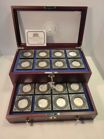 First Commemorative Morgan Silver Dollar Collection in Display Box with Key. Includes (16) Morgan Dollars (most are AU-BU, some cleaned). Dates inc: 1878-S, 1882-S, 1883-O, 1884-O, 1885-O, 1886, 1887, 1888, 1889, 1890, 1896, 1897, 1898, 1899-O, 1900 & 1921 - NOTE: Shipping is available on this lot and will be $25.00