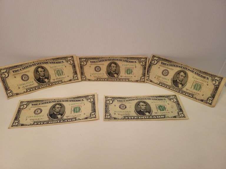 1950-B, (2) 1950-C, 1950-D & 1963 $5 Federal Reserve Note Lot. All are Circulated - $25 Face