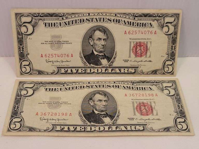 LOT 28 - (2) 1963 $5 Red Seal US Notes - F