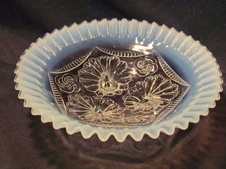 Jefferson Glass “Ruffles & Rings” White Opalescent 8” x 2.75" Ruffled Bowl