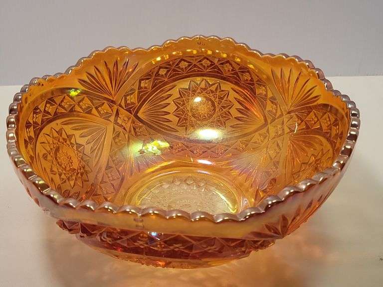 Imperial “Hobstar & Arches” Marigold 10” x 4" Ruffled Bowl - Note some roughness and flea bite around the edge of the base