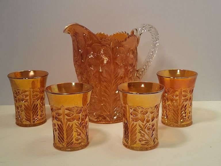 Imperial “Tiger Lily” Marigold 5-Piece Water Set-Old Imperial, Pitcher is 8.5" tall & Tumblers 4.25" tall