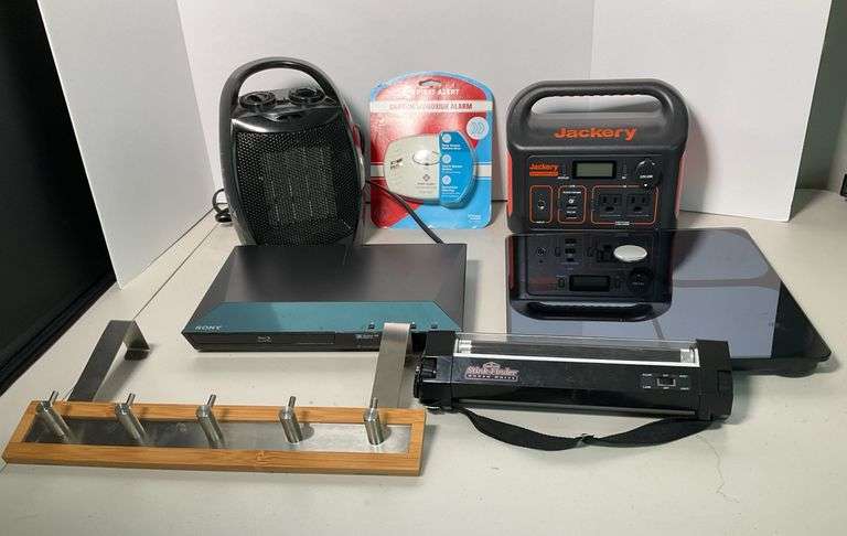 includes blue-ray DVD player, pet stain light, bathroom scale, power source, and small heater