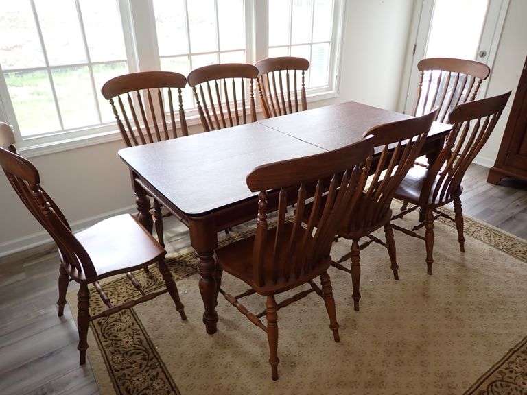 All 8 chairs, table protector and Table in excellent condition except one scratch which is pictured. This is a solid slab of wood measuring 80" long 50 wide.