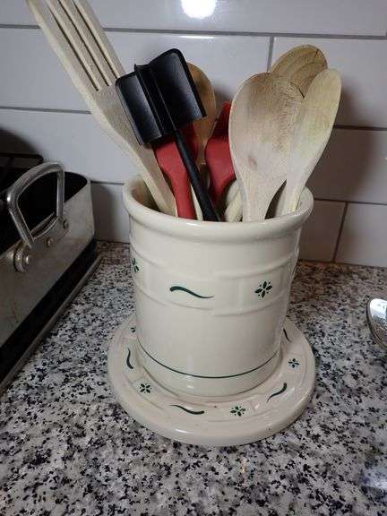 LOT 117 - LONGABERGER WOVEN TRADITIONS "CLASSIC GREEN" 5 3⁄8" CROCK-UTILITY HOLDER & 8" TRIVET HOTPLATE