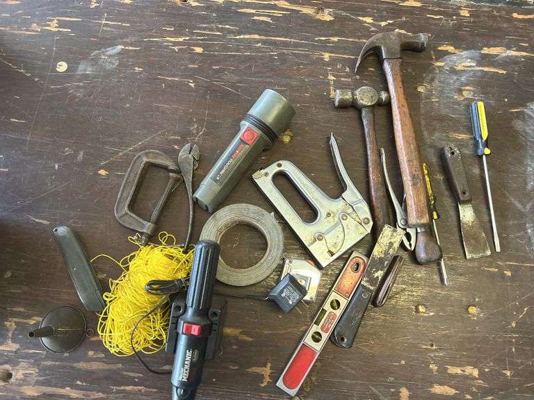 Screw driver, hammers, tape measure, cordless screw driver and more.