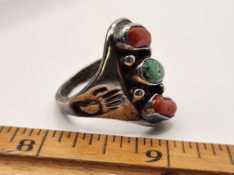 LOT 73 - Hand Made Navajo .925 Sterling Silver Ring Coral Turquoise bear claw heavy band