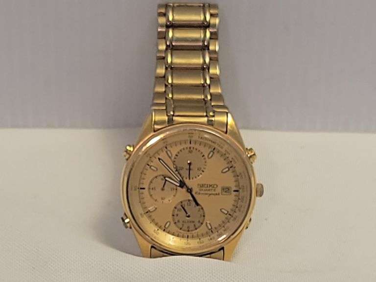 1995 Seiko Quartz Chronograph Date Alarm Men's Wrist Watch, Model Number 7T32-7B30, Face Marked 7T32-7B4L T 2, Seiko Stainless Steel Band, Serial Number 578772, Runs, Shows scratches on Crystal & Back Plate, No Box or Paperwork