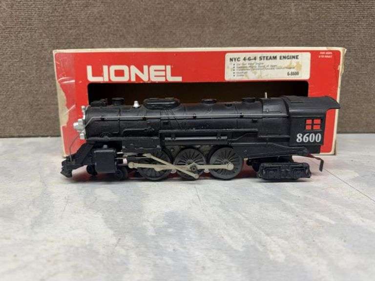 Lionel NYC 4-6-4 steam engine model 6-8600 features a die-cast metal body, electronic mighty sound of steam, transformer-controlled forward/neutral/reverse settings, a working headlight, and smoke capability. Gently used and includes the original packaging, which shows signs of wear. Sells as is.