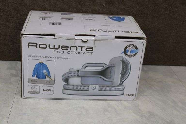 Rowenta Pro Compact Garment Steamer model IS1430 features a 1400W motor for effective wrinkle removal. Compact design with a large steam head for better steam distribution. Includes a soft touch fabric hose and allows easy continuous refill. Comes in its original box with components visible, including hose and attachment. Sells as is.