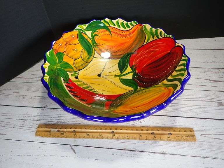 The bowl features a variety of hand painted fruits, including oranges, pears, apples, and watermelon, painted in bright, contrasting colors. The rim of the bowl is scalloped and painted with a dark blue, which contrasts with the yellow background and colorful fruit designs. The style is reminiscent of Talavera pottery, a type of Mexican and Spanish pottery known for its colorful and detailed designs.