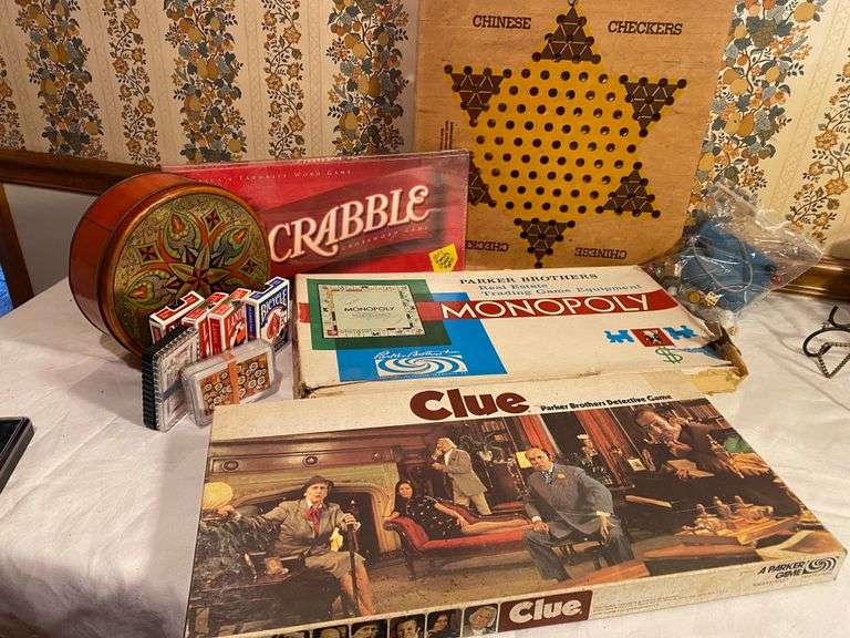 Scrabble (sealed box), Chinese Checkers, Monopoly, Clue, Six (6) decks of cards in colorful tin. Pieces have not been checked.