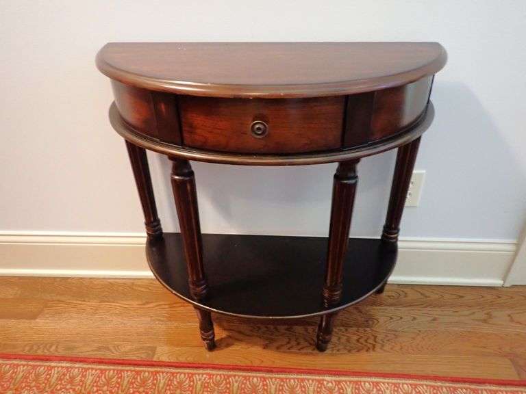 DescriptionExuding casual elegance, this beautiful Demilune Console is perfect for small spaces. Meticulously crafted from poplar hardwood solids and wood products, it has a rich, lightly distressed Madrid Brown finish over choice cherry veneers. Features include a storage drawer with antique brass-finished knob, lower display shelf and hand-carved wood legs.
