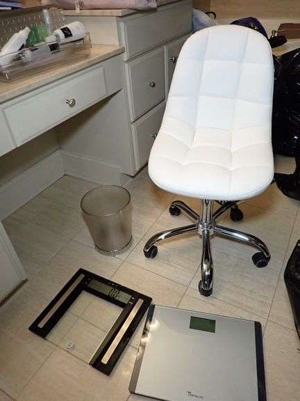 LOT 94 - White Tufted Simulated Leather Rolling Vanity Chair, 2 working Digital Bath Scales & Trashcan