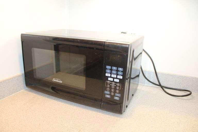 Compact countertop microwave in sleek black finish by Sunbeam. Features digital controls and versatile cooking presets. Untested. Please see photos for more details. In overall good condition with finish wear. No other items included.