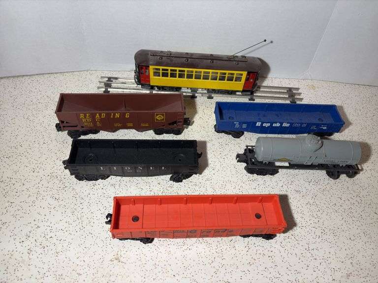 Five Lionel train cars to include a Sunoco, Republic Steel, Reading, Lionel, and Rio Grande, also a trolley car that has no markings The trolley car is metal and motorized