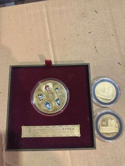 Boxed Chinese 2008 Olympic gold commemorative coin. Also include included our two Davenport hotel Spokane, Washington commemorative coins. Unknown material.