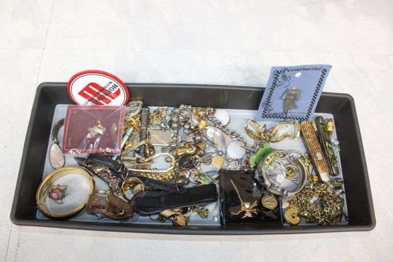 A variety of costume jewelry, watches, necklaces, bracelets, brooches, pendants, and other assorted accessories. Notable items include a carded Pewterberries ornament, a House of Lloyd piece in packaging, and a pocket knife. Assortment contains gold-tone, silver-tone, and mixed material items. The tray featured in the image is not included. Please see the photos to help determine the condition and the value for yourself. Sells as is.
