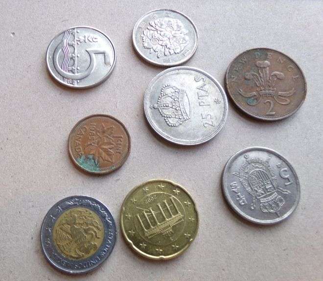 8 foreign coins: 1 Marked 2 pence no date, 1 Mexico 1997, Oldest is 1975