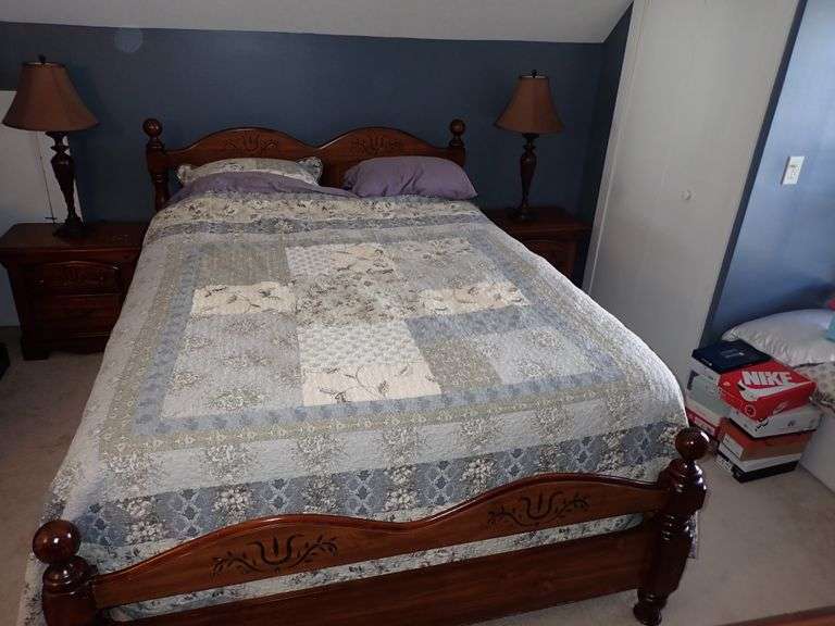 This lot includes the headboard/footboard/siderails/slats. It also includes the comforter and bedding pictures along with the Queen Box spring. Queen Mattress is not included.