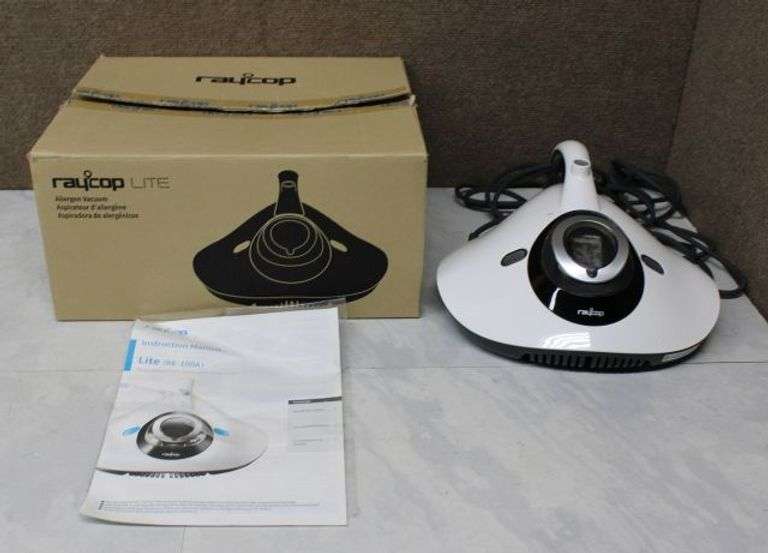 Raycop Lite allergen vacuum cleaner, model RE-100AWH, designed for household use. The lot includes the vacuum cleaner unit, original box, and instruction manual. Features a 120V, 60Hz, 275A power system, certified to ANSI/UL standards. Made in Korea and labeled for reducing allergens and bacteria. The item is in good working condition. Please see the photos to help determine the condition and the value for yourself. Sells as is.
