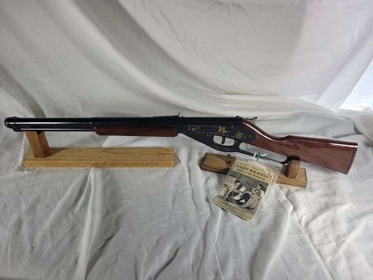 Daisy Model 94 Lever Action BB Gun w/Daisy BB Rifle Instruction Booklet. Rogers, Arkansas. Plastic Stock and Forearm, Fake Hammer, Cowboy Roping Steer on Side, Action works and fires. Forearm is bowed and loose. Overall very presentable.