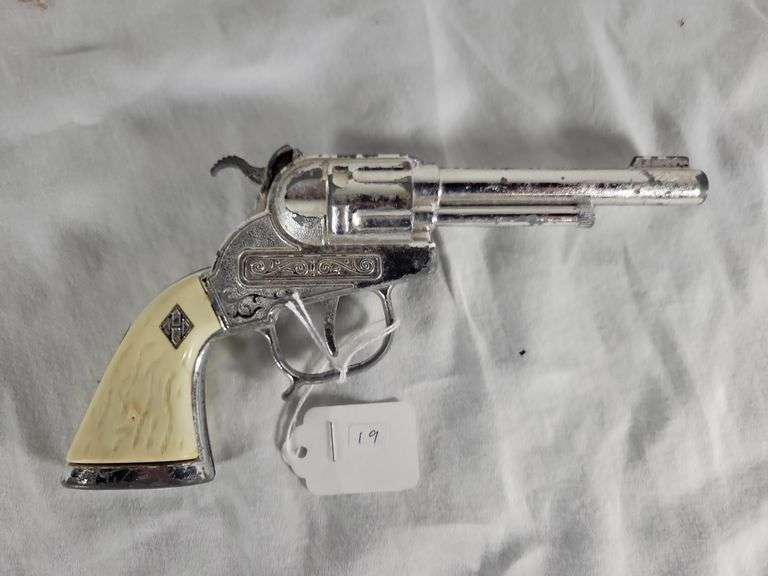 Hubley Cap Gun (for roll caps). Measures 8.5" total length. Faux Chrome shows some flaking and play use. Trigger sticks, will fire but need to manually release trigger each time pulled.