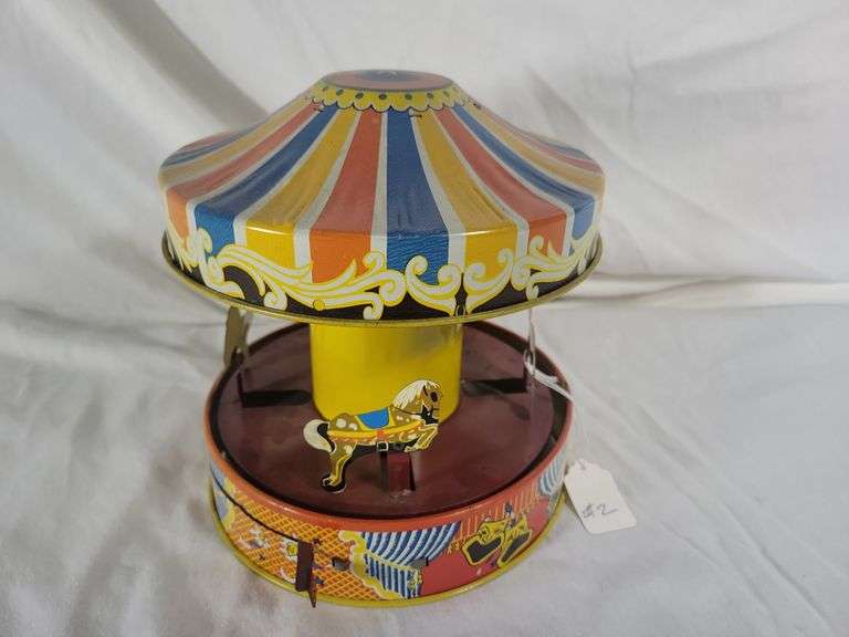 Wolverine Lever Action Musical Tin Litho Carousel with (4) Horses. Lever Action Works. Litho in very good condition. Needs a light cleaning.