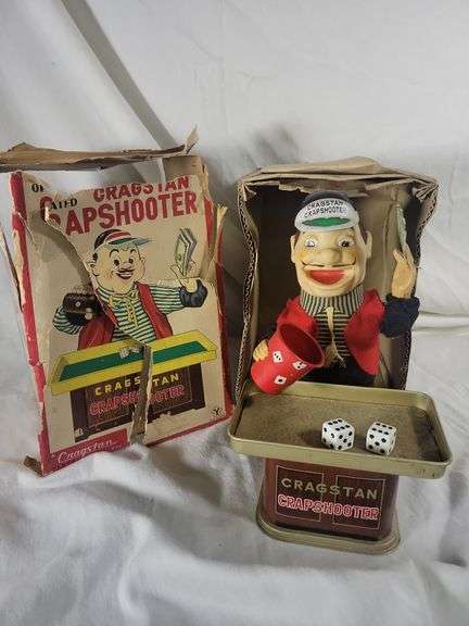Cragstan Battery Operated "Crapshooter" with Box. Can not get the switch to engage, not working, Battery Box is Clean, Has some minor wear on toy. Box is in Poor Condition, Many Tears, Tape.