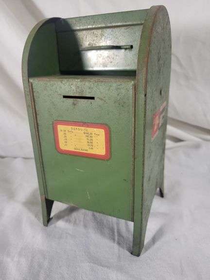 All American Steel Air mail- Air Parcel Post Mail Box Bank. Has Paint Wear and Surface rust, missing Bottom Plate, Decals are in Good Condition.