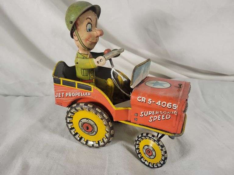 Unique Art G.I. Joe and His Jouncing Jeep Tin Litho Wind Up. Wind-Up Works but could use a good cleaning and some oil. Litho shows play wear and some fading.