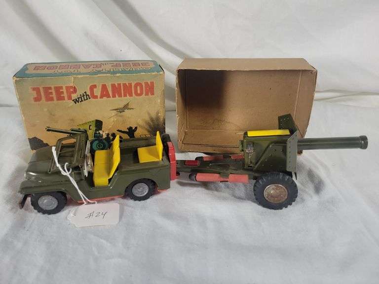 1950/60's SSS #1113 Japan Tin Litho Friction Jeep with firing Cannon & Original Box. Litho is in Excellent Condition, Friction Drive Works, Cannon has two projectiles and does fire. The right rear tire is flat spotted, Chrome Trailer wheel has surface rust. Box is in Good Condition with minor tear at top and corner tear at bottom. .