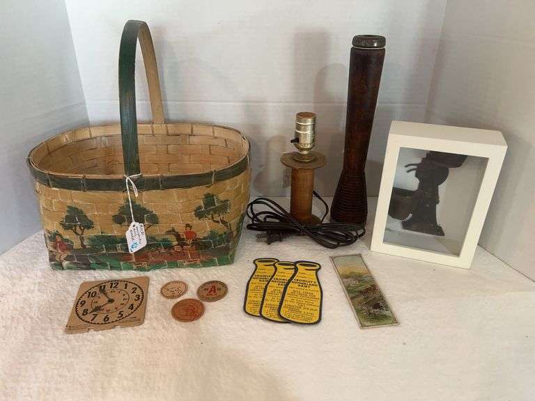 Antique handpainted horse basket, mounted and framed DeLaval Separator matchstick holder, old thread spool made into a lamp base, antique spindle, and old advertisements.