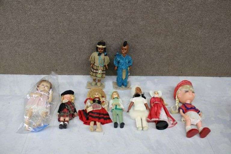 Nine assorted dolls, including Heritage Dolls handcrafted by the Oglala Sioux, featuring genuine leather clothing and beaded details. The set also includes a doll from Uneeda Doll Co., marked 'Hong Kong,' and various other dolls in diverse traditional outfits with fabric and plastic constructions. Conditions vary; some dolls show wear consistent with handling and age. Please see the photos to help determine the condition and the value for yourself. Sells as is.