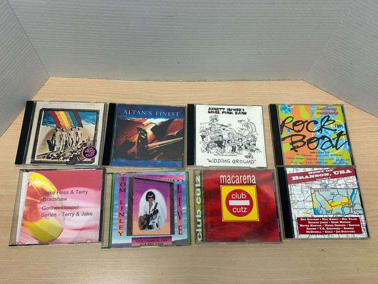 Includes The World of the Statler Brothers, Altan’s Finest, Arnett Howard’s Cruel Funk Band – Kiddin’ Around, Rock the Beat (Sam Goody compilation), Jake Hess & Terry Bradshaw – Gaither Gospel Series, Tom Linley – Live, Macarena Club Cutz, and Best of Branson, USA (featuring Mel Tillis, Wayne Newton, Boxcar Willie, Moe Bandy, and more).CDs are being sold as-is.