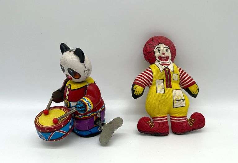 Vintage Tin Wind Up Panda Drummer Toy & Ronald McDonald Plush