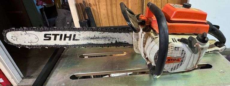 Stihl 041 AV chainsaw featuring a gas-powered engine, an orange and white body, and an extended 20-inch bar. Includes integrated hand guard and chain brake. Shows signs of use with wear on the bar and housing. Fully functional condition not verified.