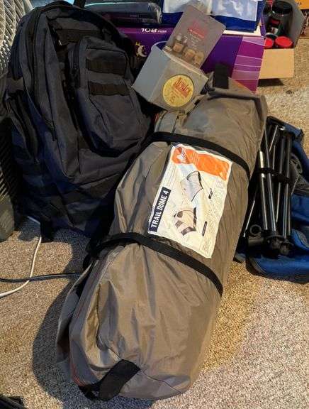Includes a Trail Dome 4-person tent in its original carrying case and an adjustable black tactical backpack with multiple compartments and MOLLE webbing. Both items appear used but functional. Tent dimensions and internal setup details are printed on the package.