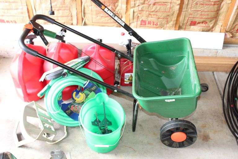 Scotts broadcast spreader, garden hose, red gas cans, and accessories, untested. Please see photos for more details. In overall good condition with finish wear. No other items included.